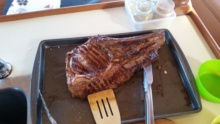 The days since our big repair had been good.  In fact, Christmas, December 25th, was one of our best weather days, with winds not going over 25 knots, thus our ride was great with light rolling to 10°, worst 15°.  I made our last big steak and candied sweet potatoes.  We even opened a bottle of Bordeaux that my French friend PJ had given me.