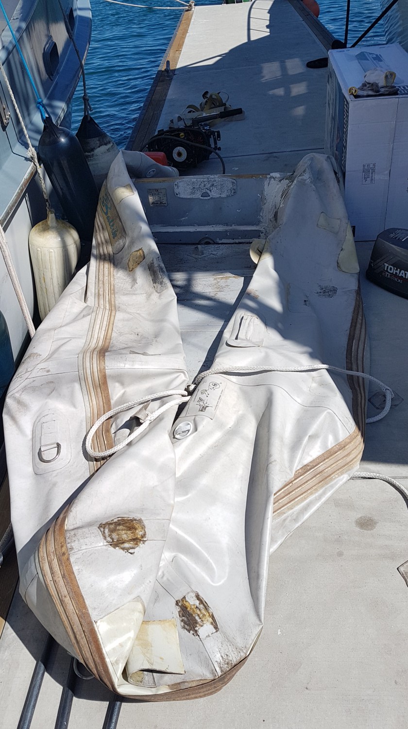 Another hour of foot pumping, my new dingy was good to go. Now, to get the outboard working. Of course, after The First and Nearly the Last almost a year of non-use, it was a no-go.