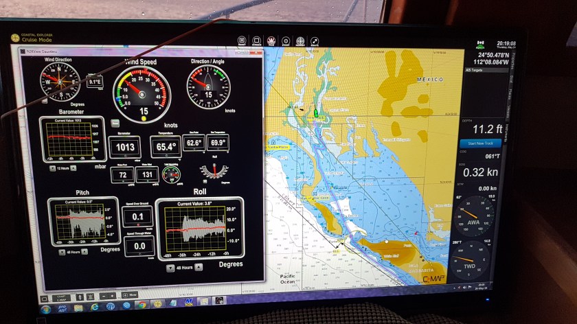 12 miles and two hours later, as we approached Puerto San Lucas, we got the call again. This time, it was loud and clear that the port was closed due to the anticipated high winds. I suspected that, so we told them we were going to head a couple miles further north to anchor in the lee of the mangroves. That was met with happy approval, since it was clear in the tone of the conversation, that the port captain didn’t like telling us the port was closed to us.