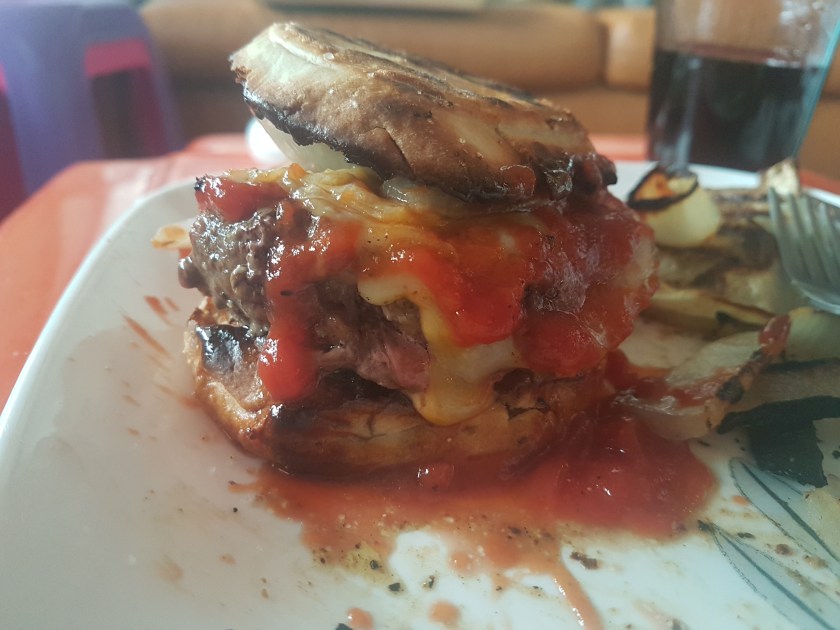 My dinner: medium-rare hamburger, 5 minutes one side, 3 minutes other side, no wind on Weber Q 280 grill. Today, with cheese, grilled onion slice, butter, ketchup on English muffin.