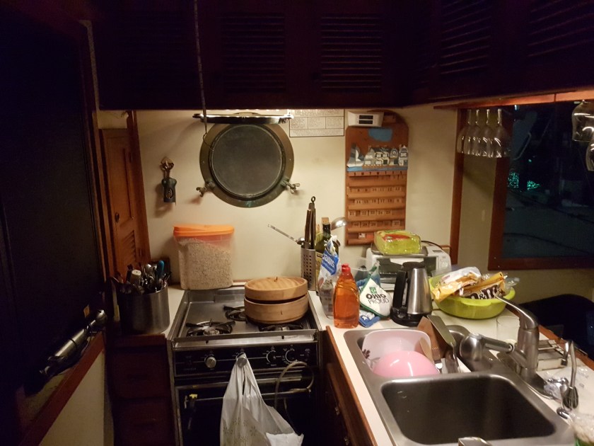 I told you of my plan to add a 16’ rope of LED lights for my galley. I t had occurred to me that Dauntless is a bit dark at night in the salon and galley. While I have under counter lights, that do a good job when cooking or cleaning, looking in the cabinets are another story. I know where everything is or at least how it is organized, but thinking about Ti, everything on Dauntless will be new.