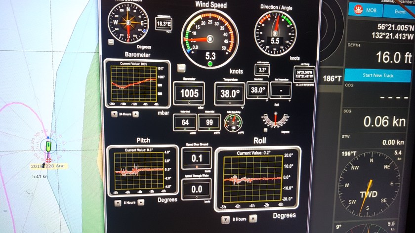 The Maretron data showing pitch and roll. This was taken while we were on anchor. Honestly, the pitching on this looks worse than I remember it. And I hate pitching.