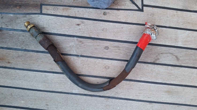 So, we’d start at the rudder piston in the lazzerrette. Open the hatch, and at this point, a wonderful sight (on a boat everything is relative), hydraulic fluid oozing from a hole in the hose just above the fitting. This hose, one of two, for the rudder piston.