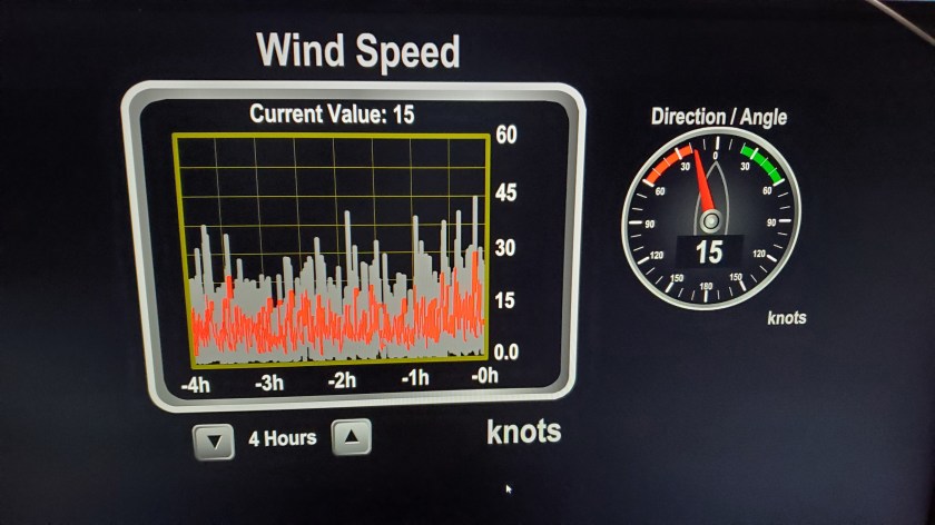Just before midnight the winds came down a few knots, but as they say, this was the proverbial calm before the storm, as by midnight, the winds were rapidly building again. It was to last almost 24 hours, with half that time with winds above 20 knots, peaking to 40.