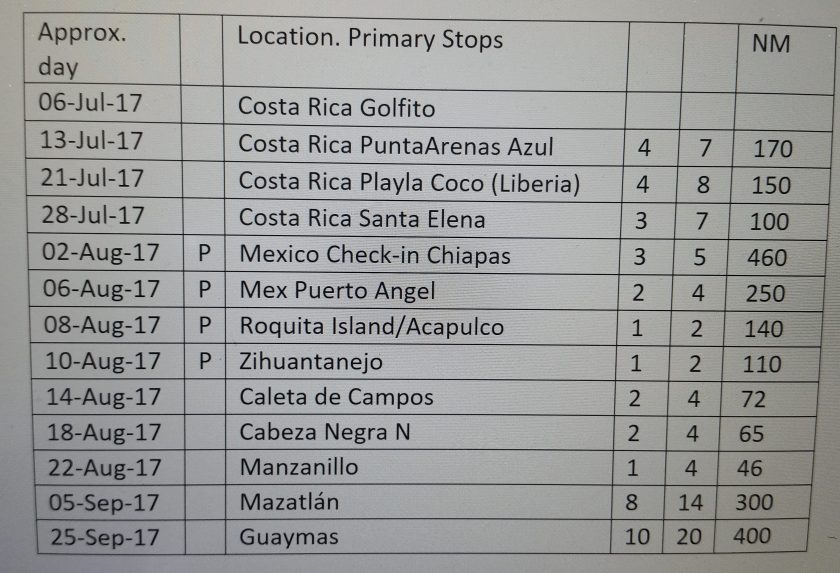 The table below is my tentative cruising program. So, for example, it shows I’ll spend about three weeks in Costa Rica, with the last stop around Santa Elena before heading to Mexico.