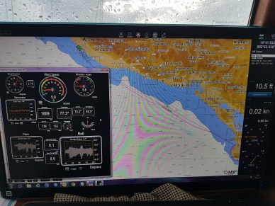 Got underway, 342° at 35 miles. Should be there in 6 hours. No need for paravanes, as the wind is out of the east (direction of the coast, about 6 miles away) the seas are relatively flat, with just the SW swell at about 2 feet and 10 second period.