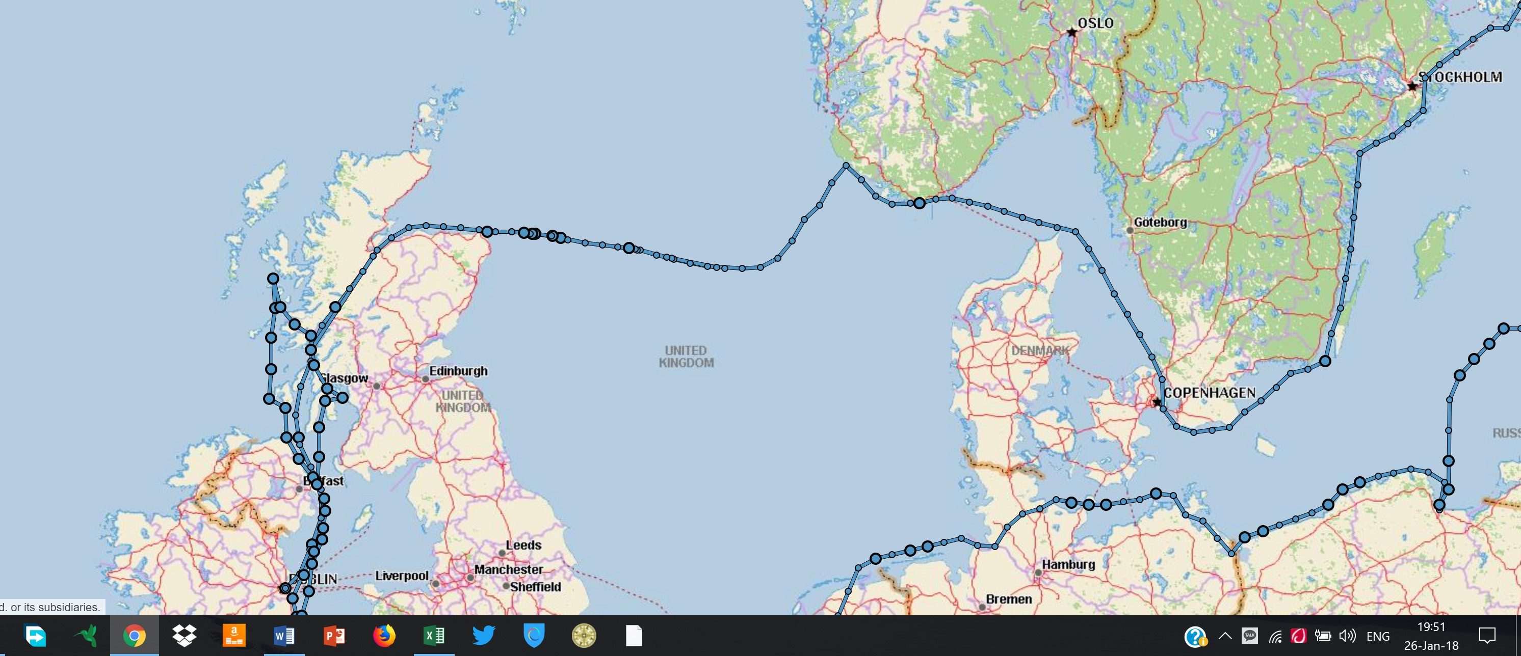 Our anticipated route with no stops in RED. The waypoints (dots) are approximately every 24 hours, so I could get a better idea to correlate the wx fcst by location and time.