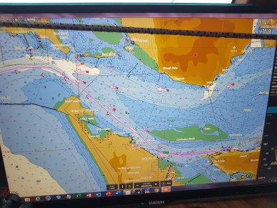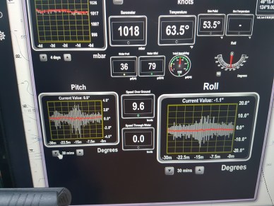That first day with any open water passages, when the boat gets rolling, any thing not secured would let its presence be known and they did. But this boat was pretty secured; Ole being an old sea dog. We had a line securing the refrigerator and freezer. The furniture was secured in the salon and we had re-stowed the loose stuff on the salon shelves.