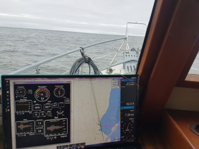 I had to take it. It meant that I left my little port of Egersund, Norway, with 35+ knot winds from the NNW and rain. If you look at my route I took to Fraserburgh Bay, Scotland, those strong winds caused that dip in my route. Even with the paravane stabilizers, it’s just easier on the boat to put the winds and resultant seas on the starboard stern quarter. After 24 hours, as the winds died, I was able to head more westerly and on the third day, to the northwest. But that little longer route also added 12 hours to the trip and the next frontal system was right on, so my last 8 hours were in the weather again.