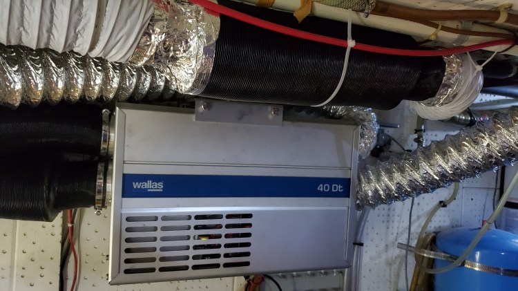 Wallas DT40 heater in the engine room, the exhaust pipe is on the top middle, hidden behind the black muffler.