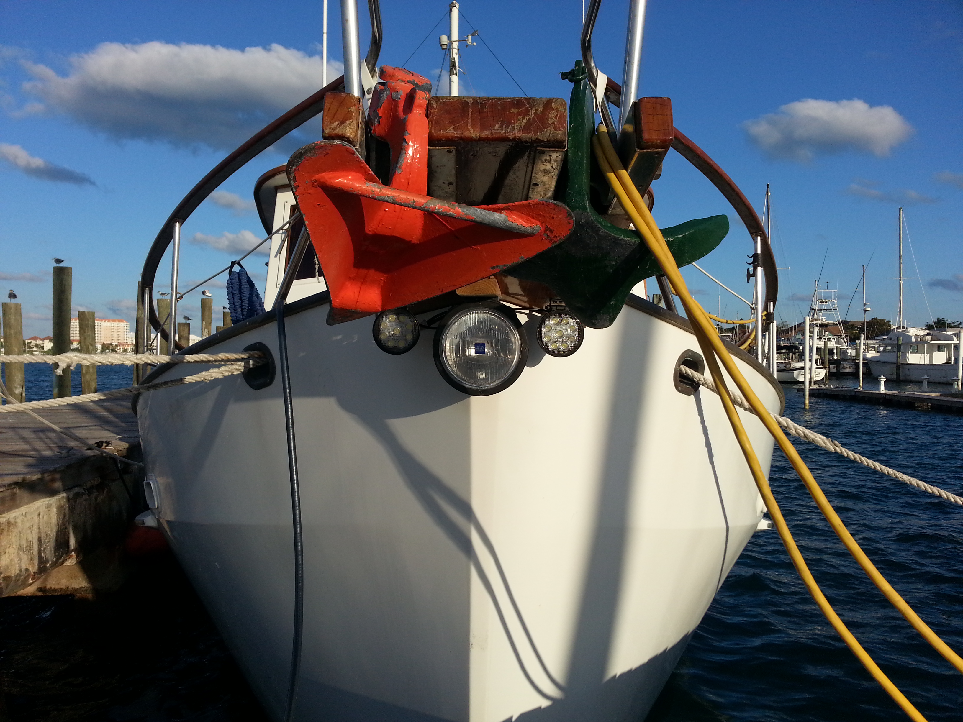 So Dauntless now has one halogen spot (Hella) and two fog lights (Chinese), with two switches near my right hand below the instrument cluster, going through the switch/breaker in the pilot house panel.