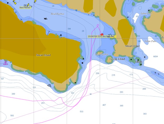 I arrived in Reid Harbor at 22:15. 82 nm, and 11 hours after leaving Neah Bay at an average speed of 7.5 kts (1 knot current assisted).