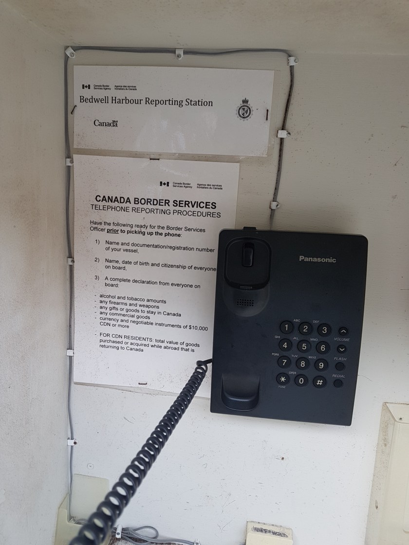 The Customs Office opened at 08:00; but that was too late for my currents, so I needed to be there by 07:00. That had the dual advantage that I could use the phone to check-in, and I could make the strong currents going north to get to Vancouver by mid-afternoon. (Yes, like too often, I had a time commitment).