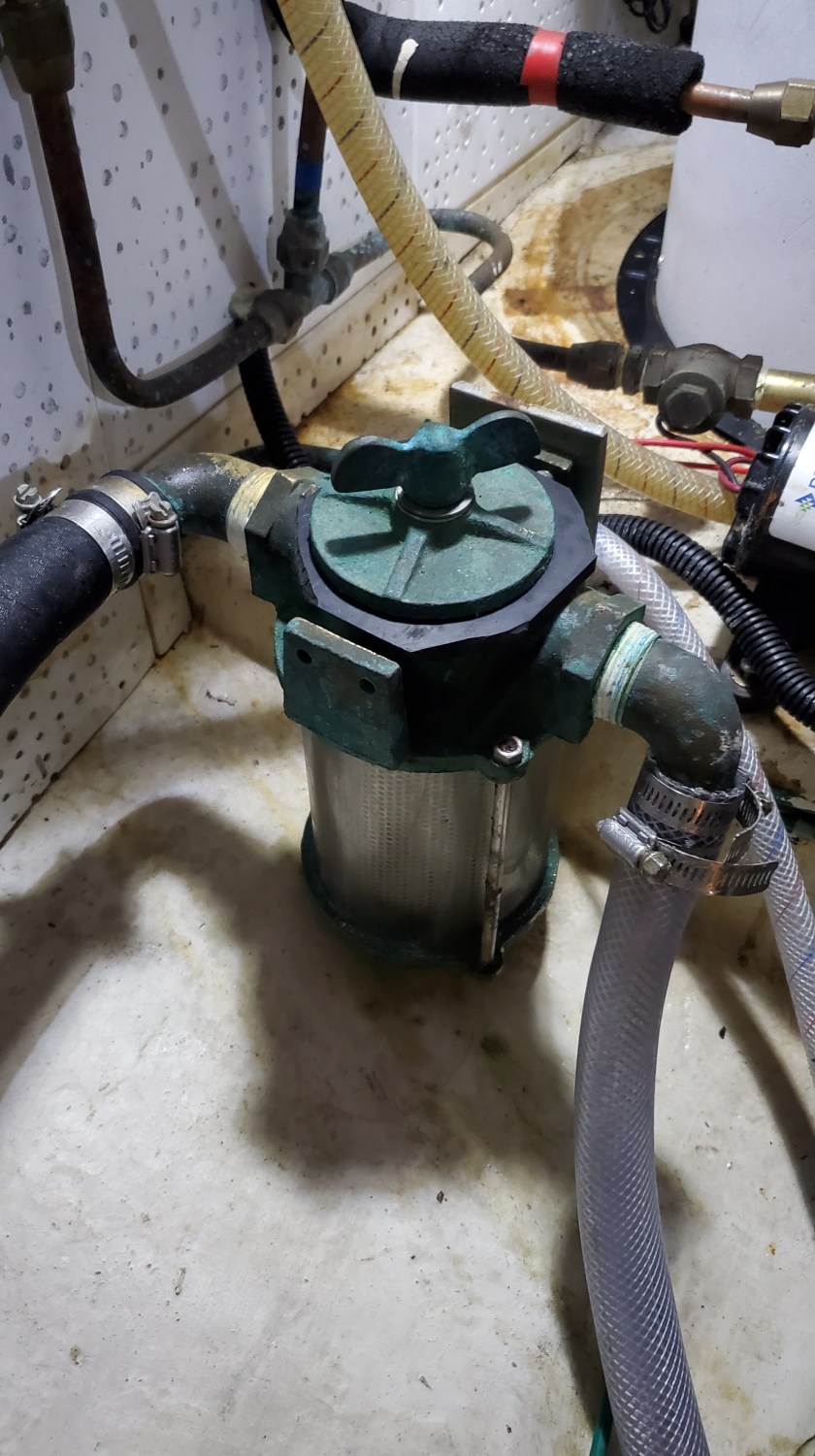 Not a bad leak, like a drip, drip drip. The sea strainer had a similar leak from the top gasket. Annoying in its own way, because the route for that water was all the way to the front of the engine room on the outside of the stringer, thru the limber hole located there and then back to the bilge on the inside of the stringer.