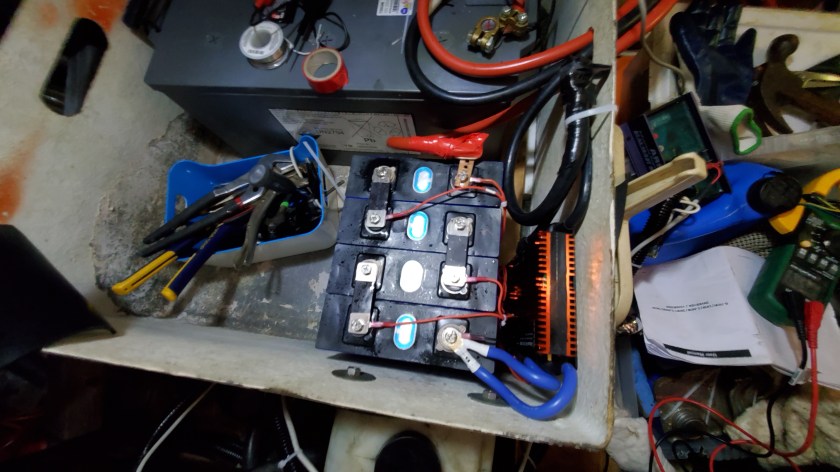 On the battery side, I decided to try ONE LiFePO4 chemistry battery, that I would put together myself using four 3.2-volt cells (each 200 AH) and a Battery Management System (BMS). Total cost for the four cells, shipping and BMS was $600, though it took two months by boat from China to Seattle, then barge to Wrangell, Alaska.
