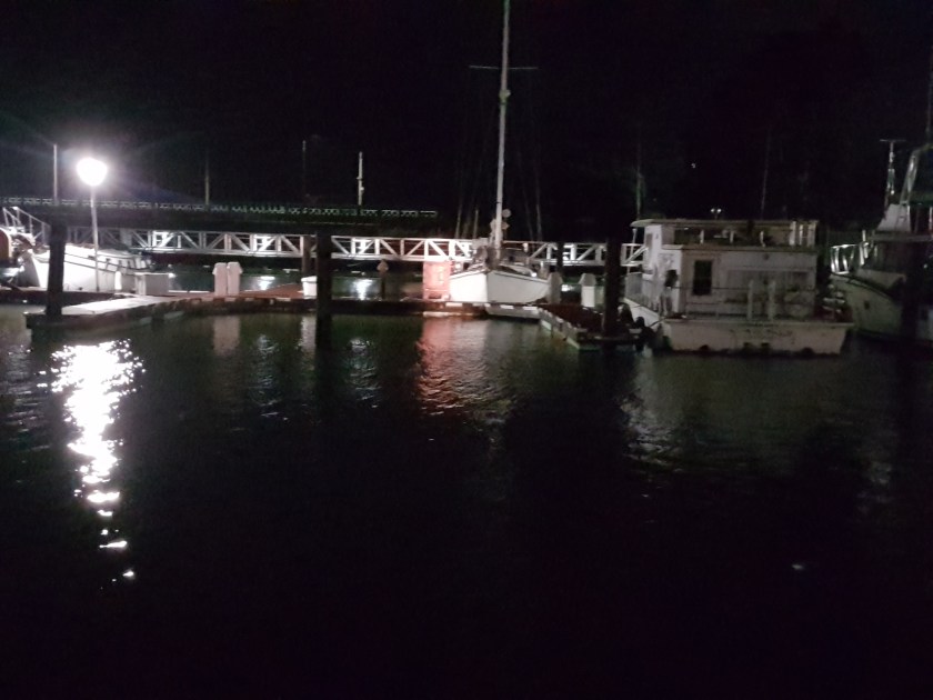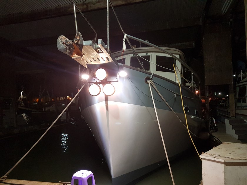 The fog lights are pointed down: to see the chain coming up and to make the boat more visible by lighting the hull, if I’m anchored in a busy area.