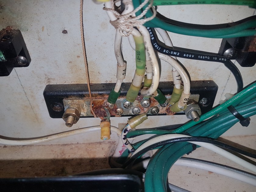 Yesterday, I completed two things on the nice to do list: replacement of the Raritan water heater anode and replacement of a terminal block for my 120-volt neutral circuits in the engine room distribution panel.