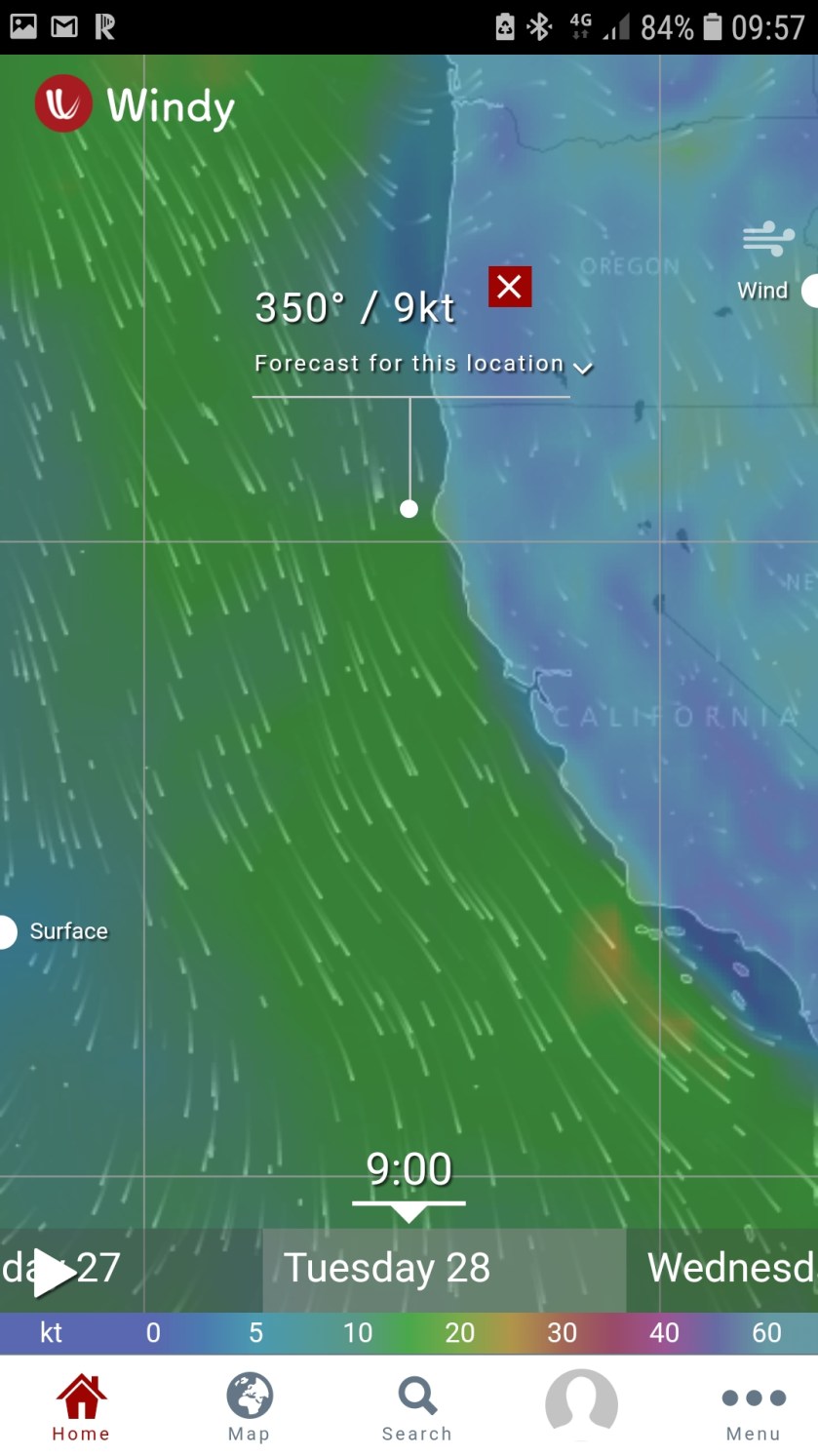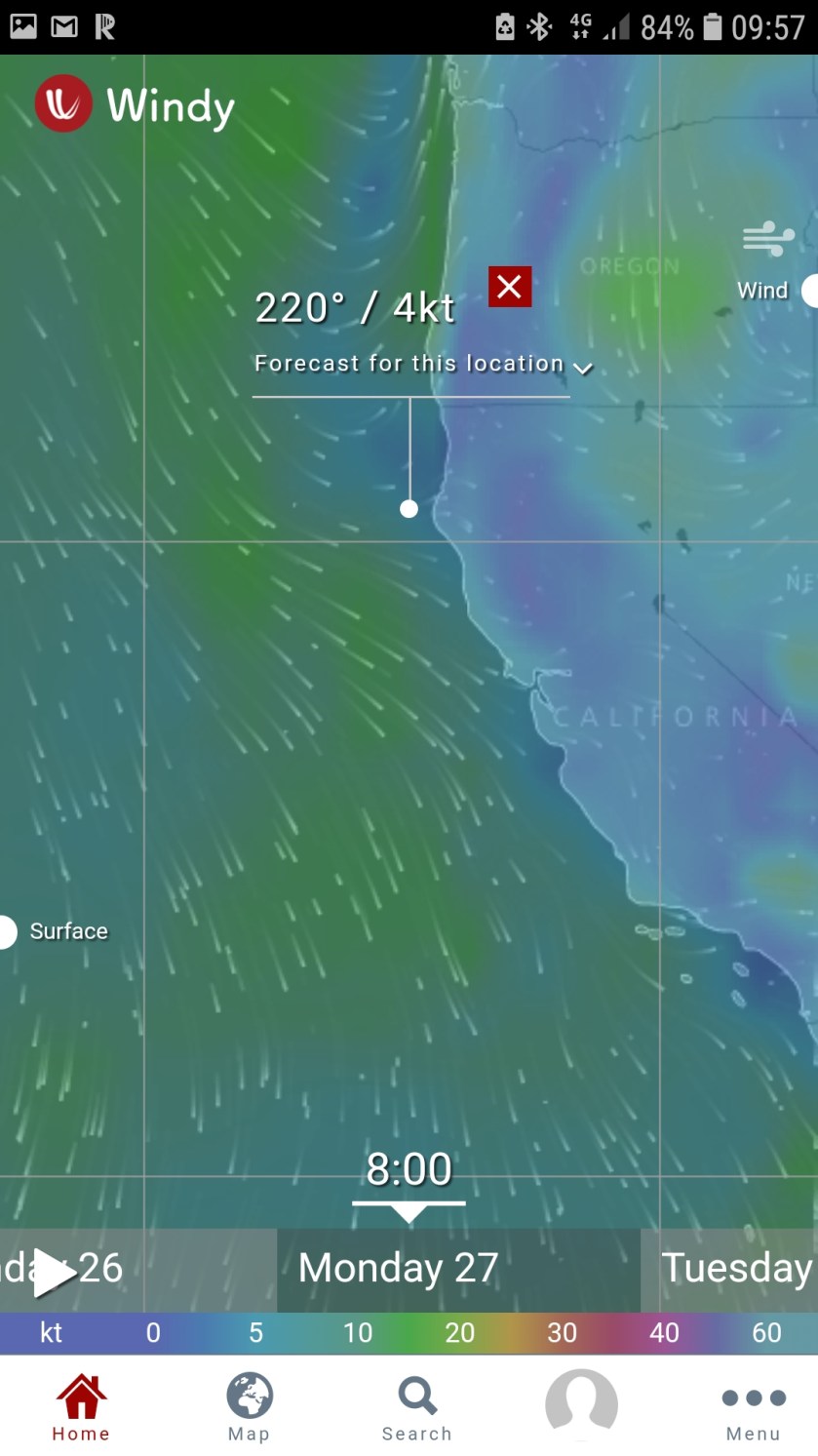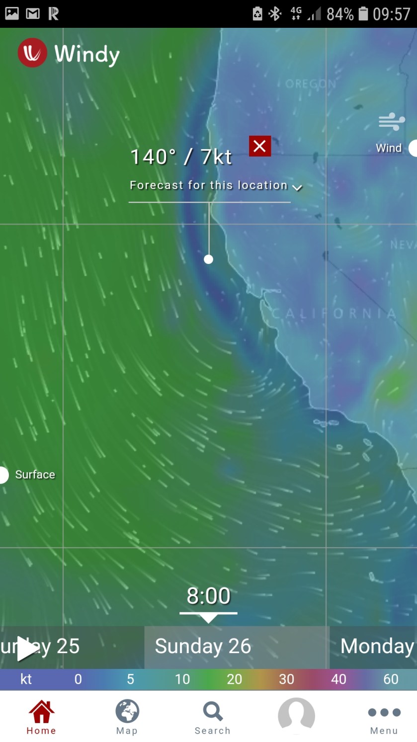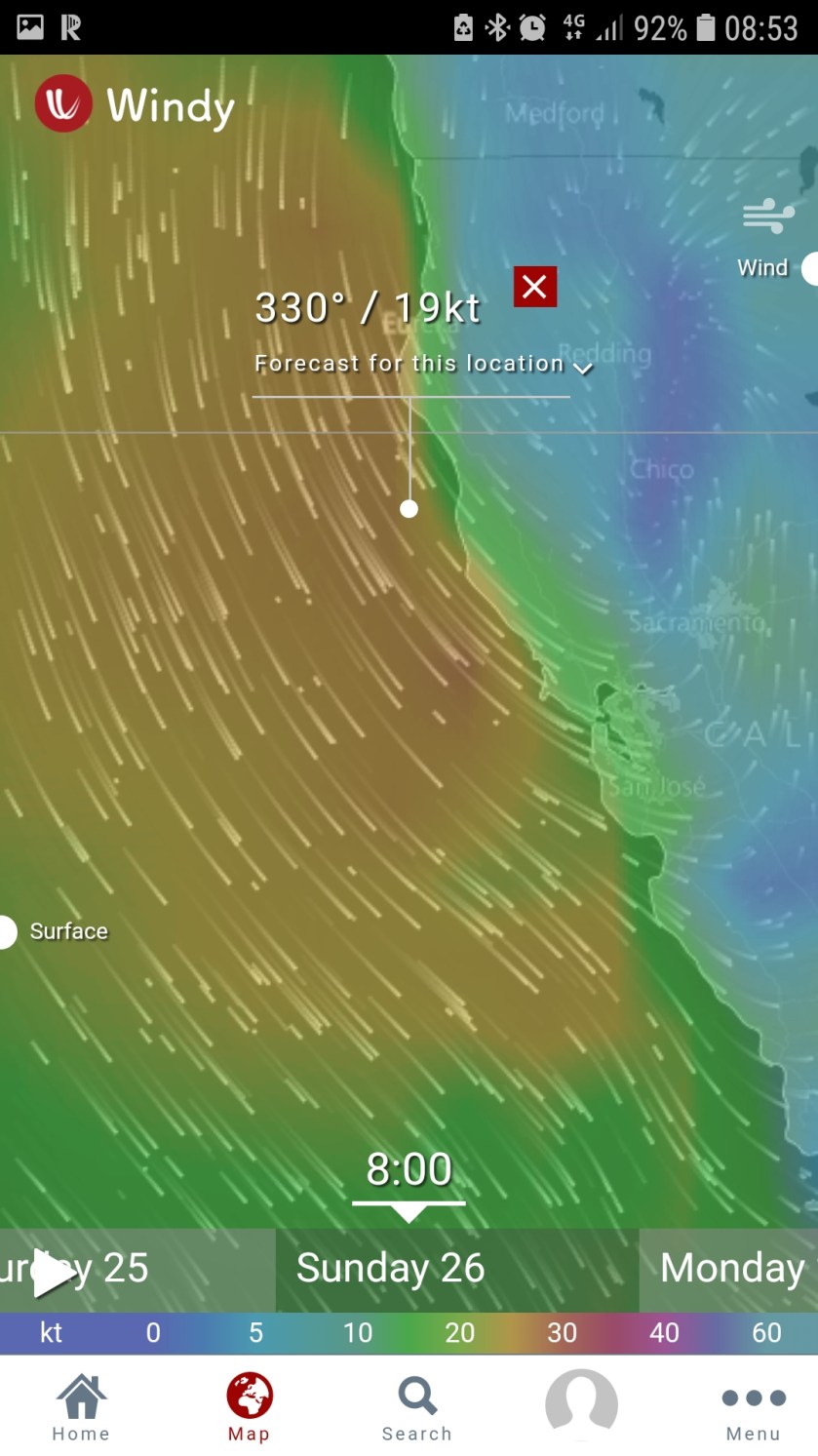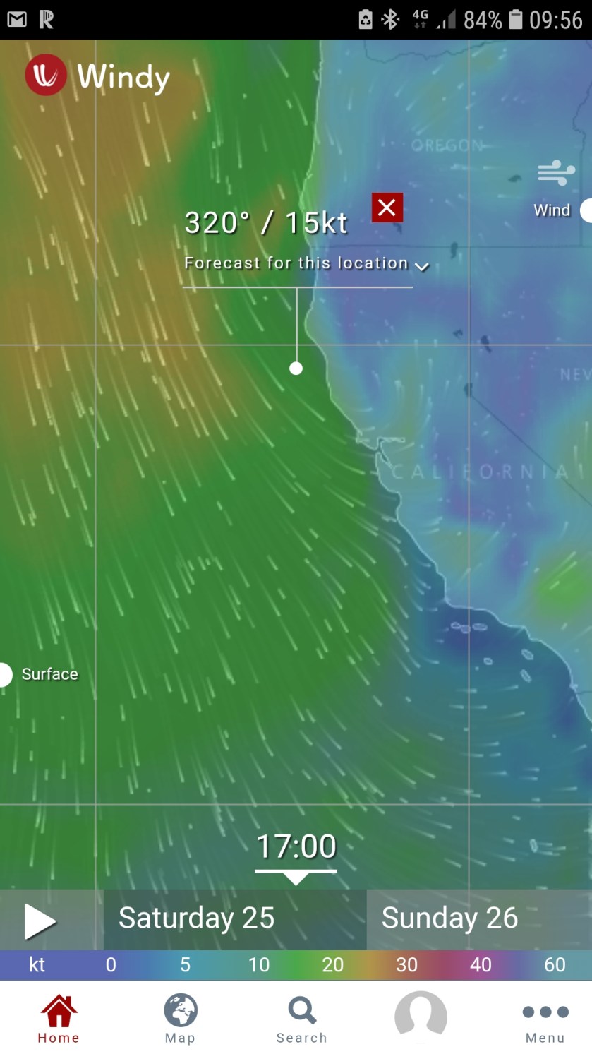 The fist picture on the left shows my main area of interest at the white dot, just south of Cape Mendocino. This is where the winds are the strongest. It’s a two day (46 hr) cruise to Crescent City, just north of that spot.