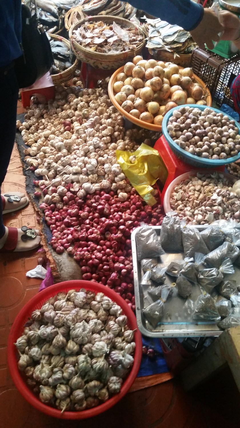 People waiting outside the marketTrigh gets some chopped garlicThree different types of garlic. Bottom basket is from Vietnam, as is the red garlic. top of picture garlic is from China. It’s cheaper but is to be avoided.traffic jam